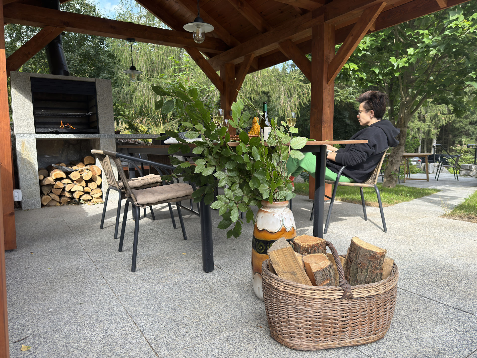 Drewniana wiata biesiadna wraz z grillem i kominkiem zewnętrznym przystosowana na 14 osób.