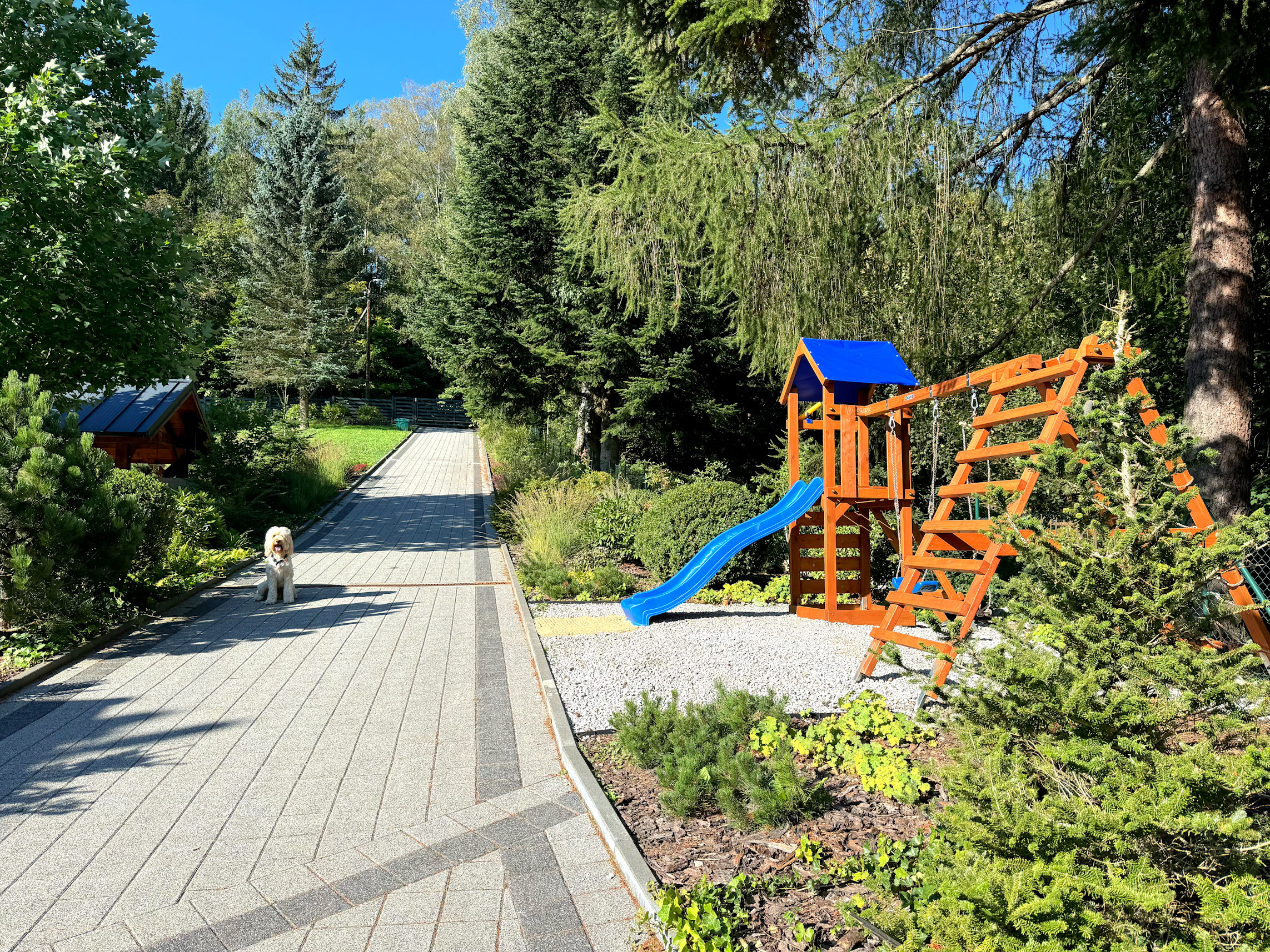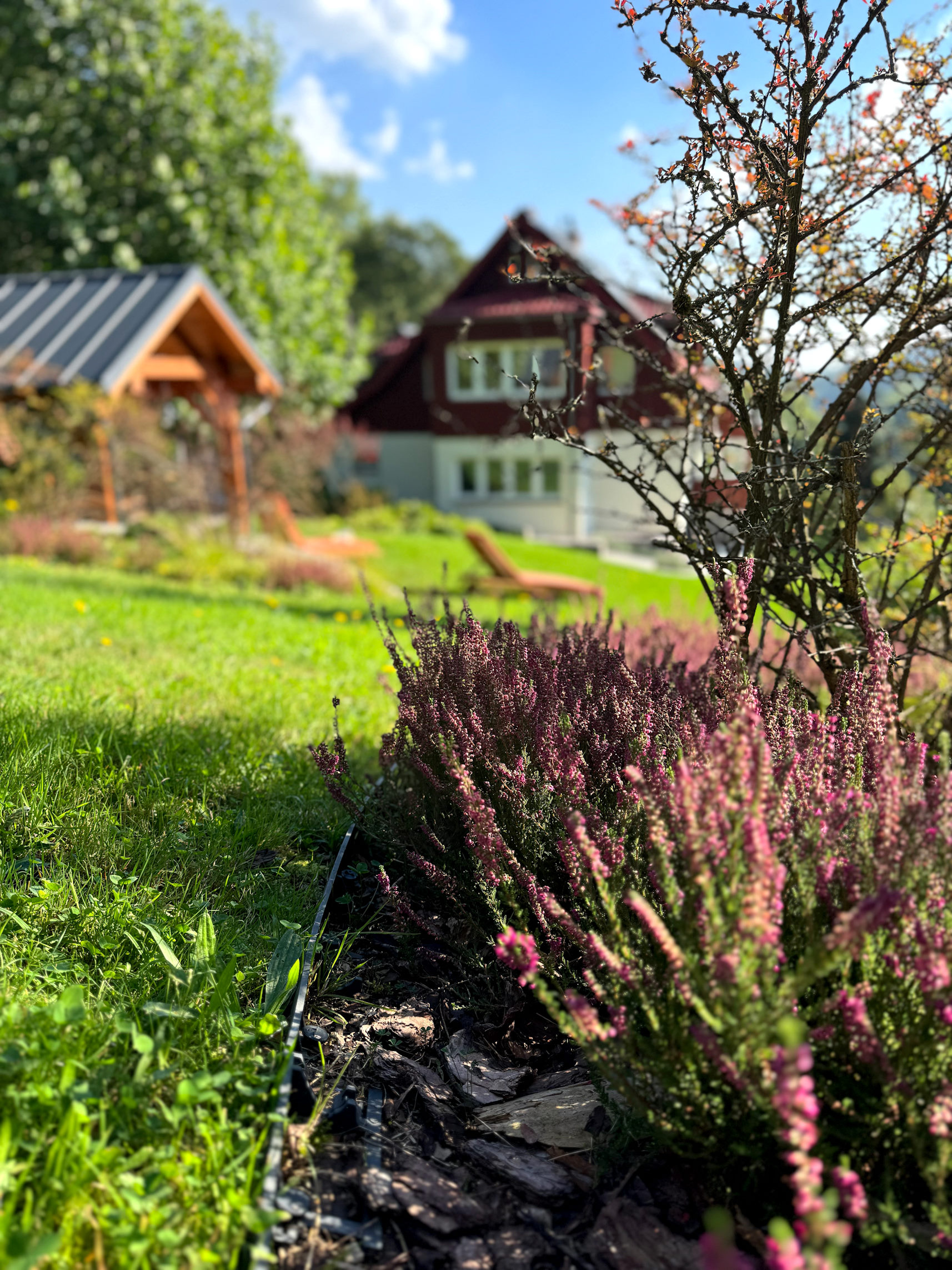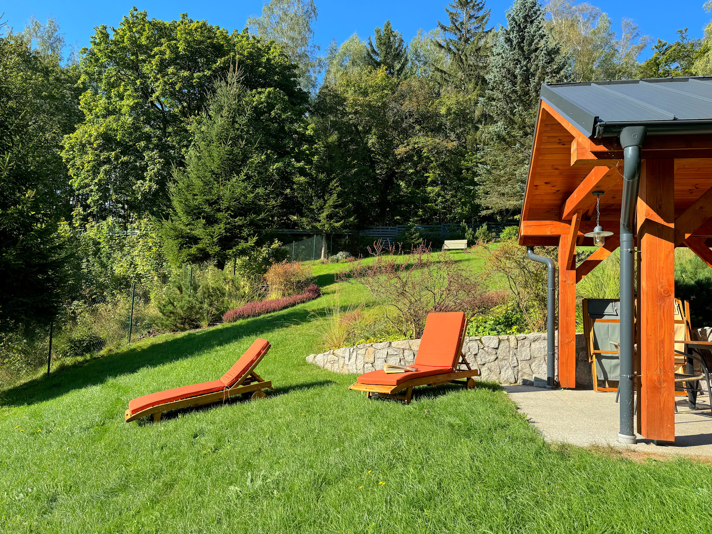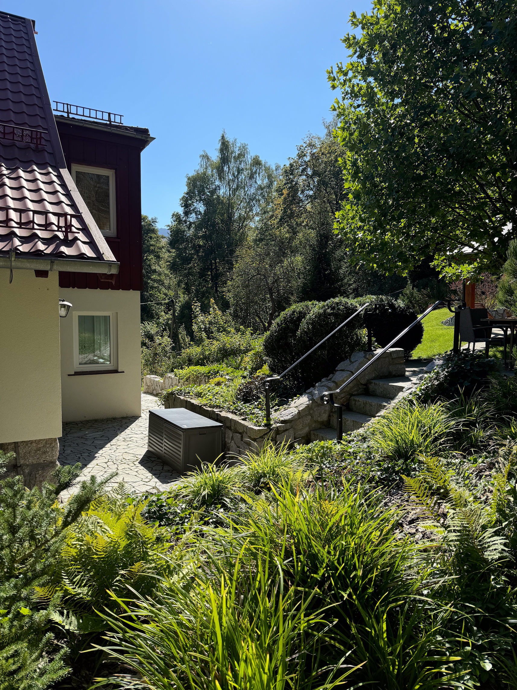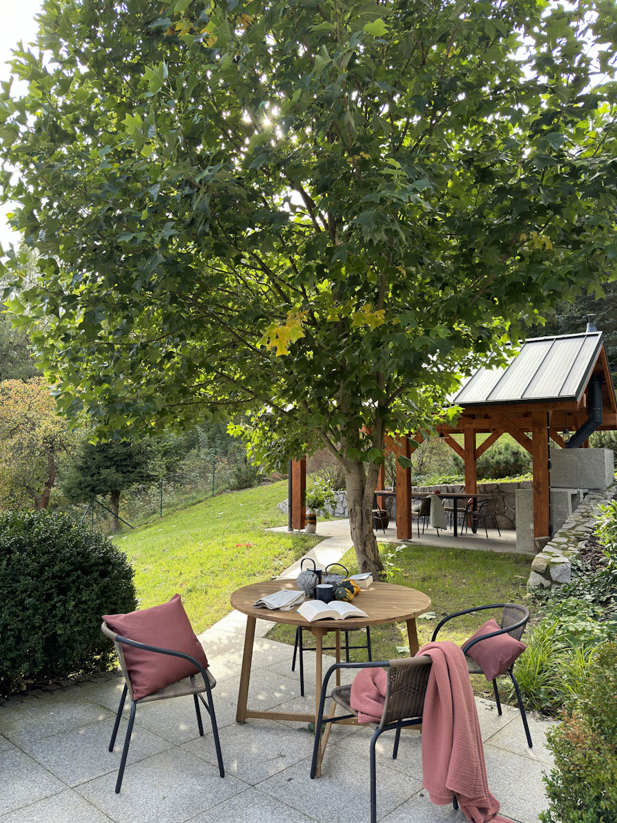 Walorem domu wakacyjnego jest ogród z bogatą roślinnością i miejscami do rekreacji na zewnątrz: