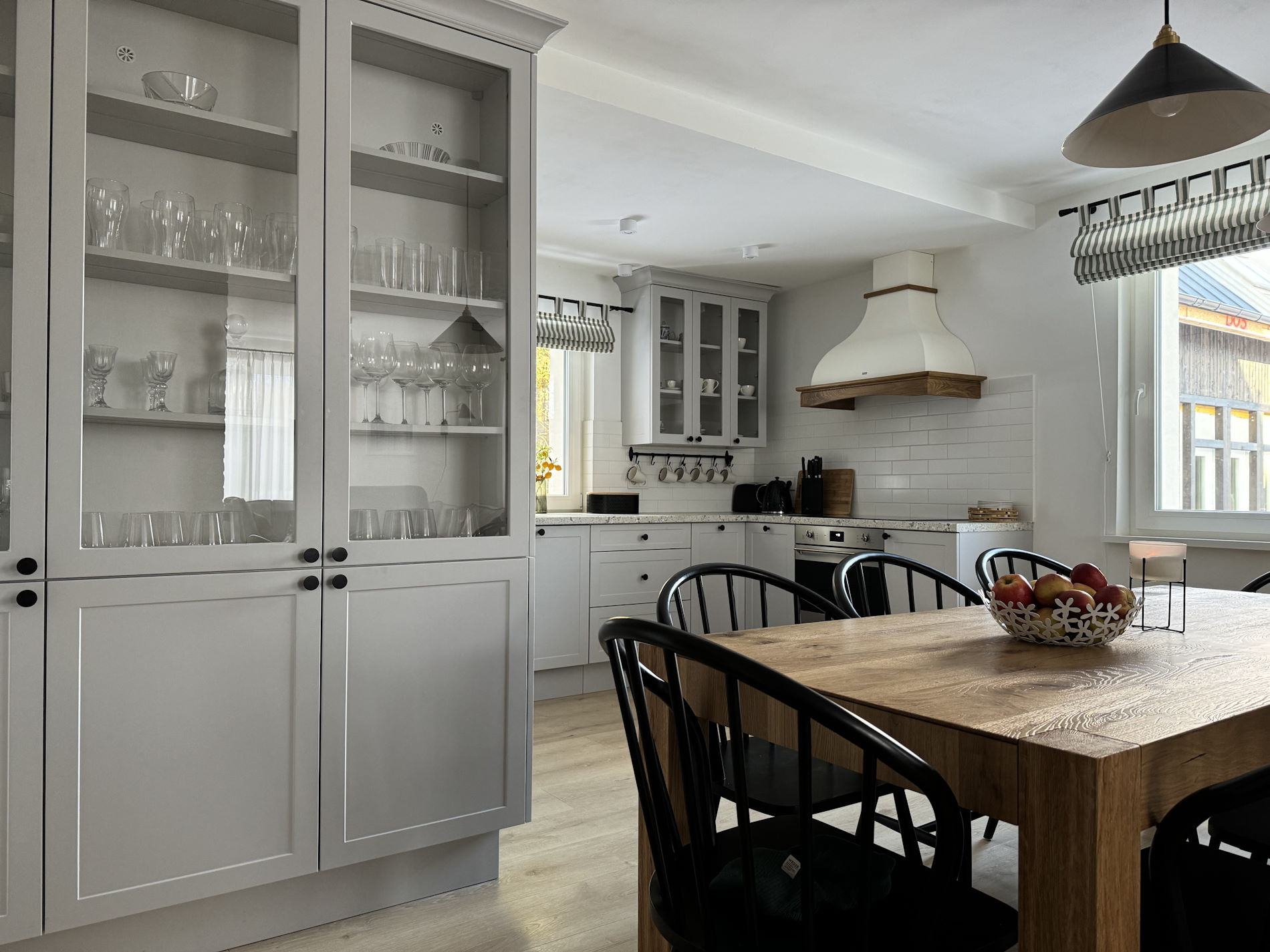 Na parterze znajduje się do dyspozycji gości salon z narożnikowym kominkiem, komfortowymi meblami wypoczynkowymi, TV satelitarna i Wi-Fi. Salon jest połączony z kuchnią dobrze wyposażoną w potrzebne sprzęty do samodzielnego przygotowania całodniowego wyżywienia: lodówka, zamrażarka, mikrofalówka, ekspres do kawy z młynkiem, płyta indukcyjna, piekarnik i dębowy stół na 10 osób. Salon i kuchnia mają ogrzewanie podłogowe.
