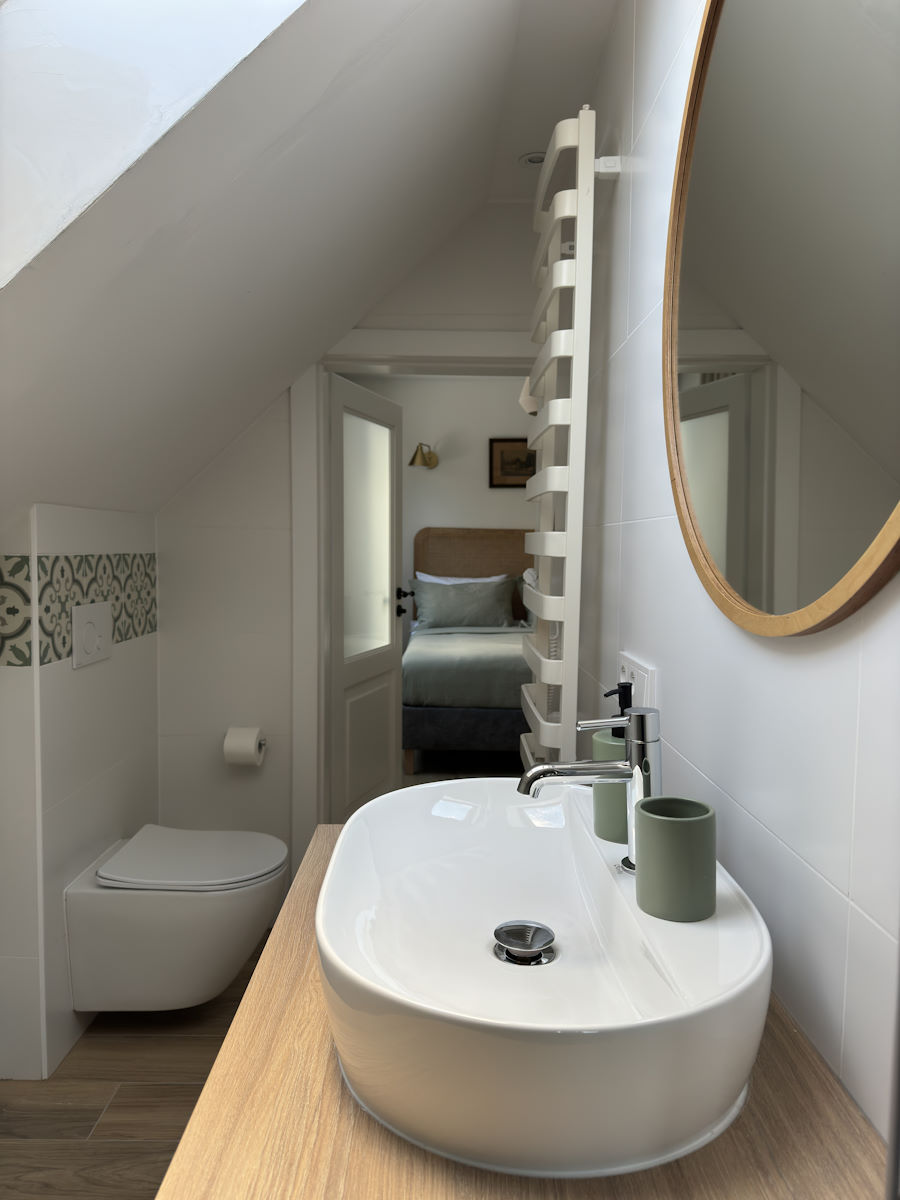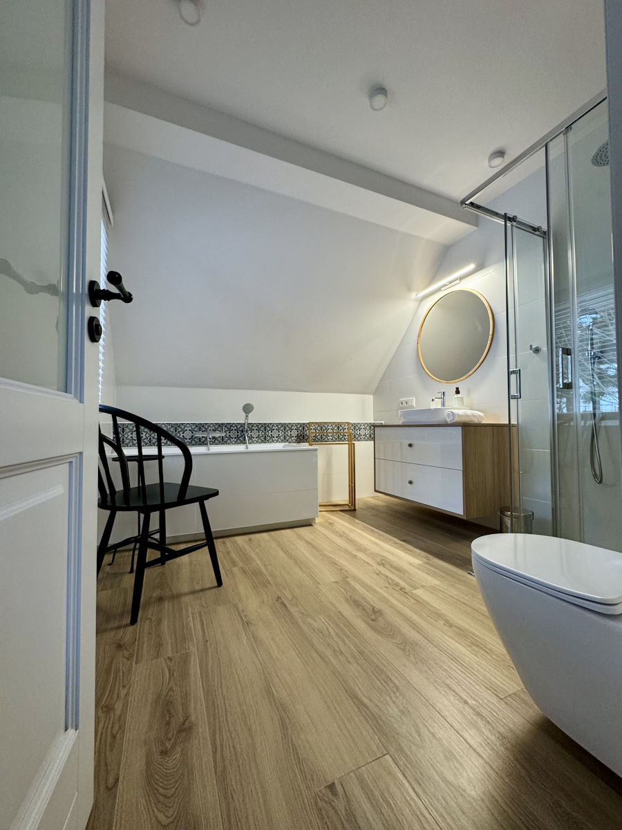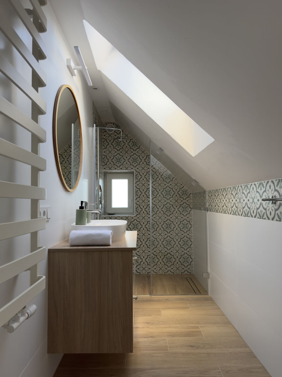 Na pierwszym piętrze znajdują się trzy wygodne, dobrze wyposażone sypialnie –przeznaczone na komfortowy nocleg dla łącznie 7 osób dorosłych lub 6 dorosłych i dwójki dzieci–, z własnymi nowoczesnymi łazienkami z ogrzewaniem podłogowym.