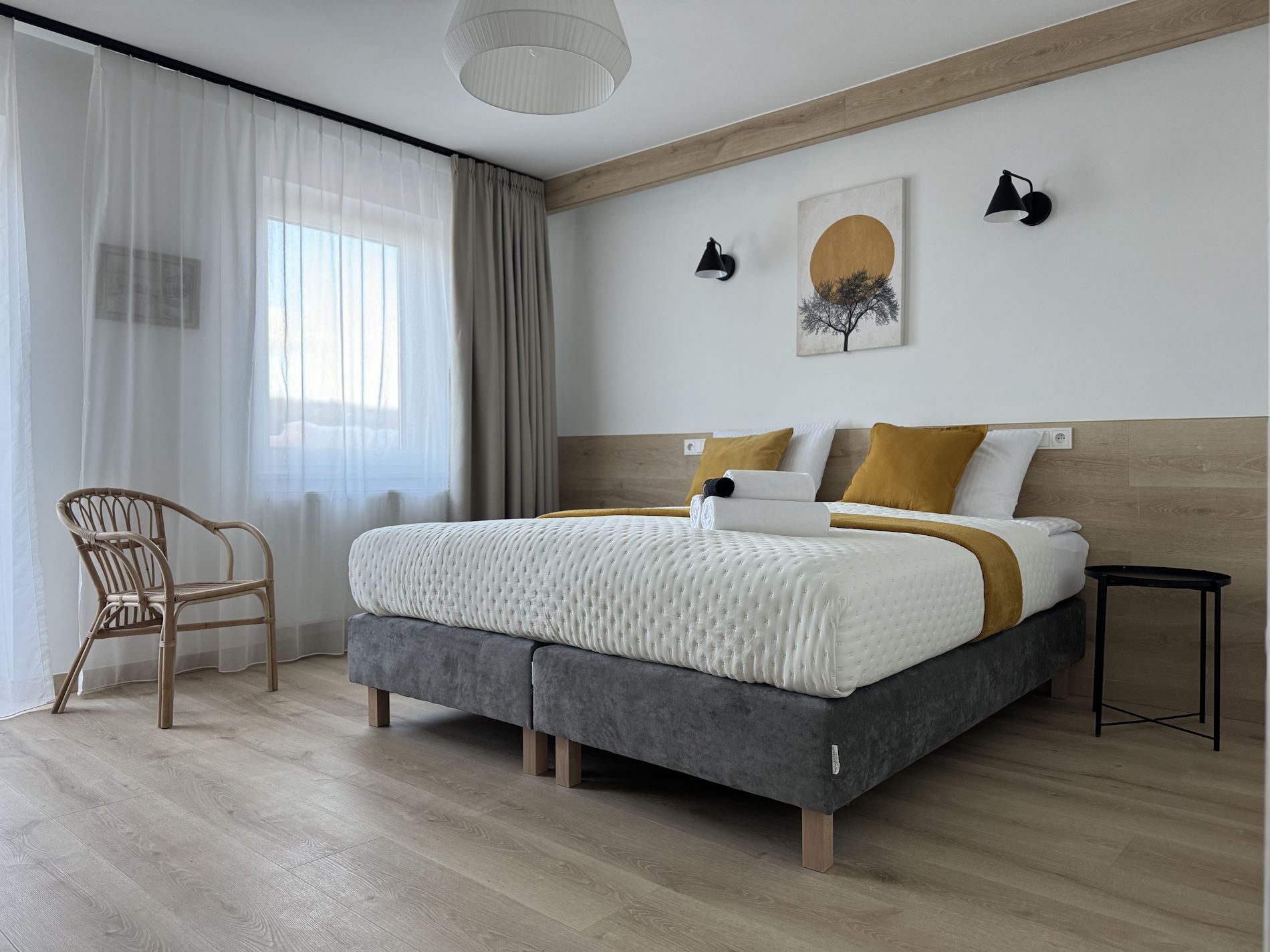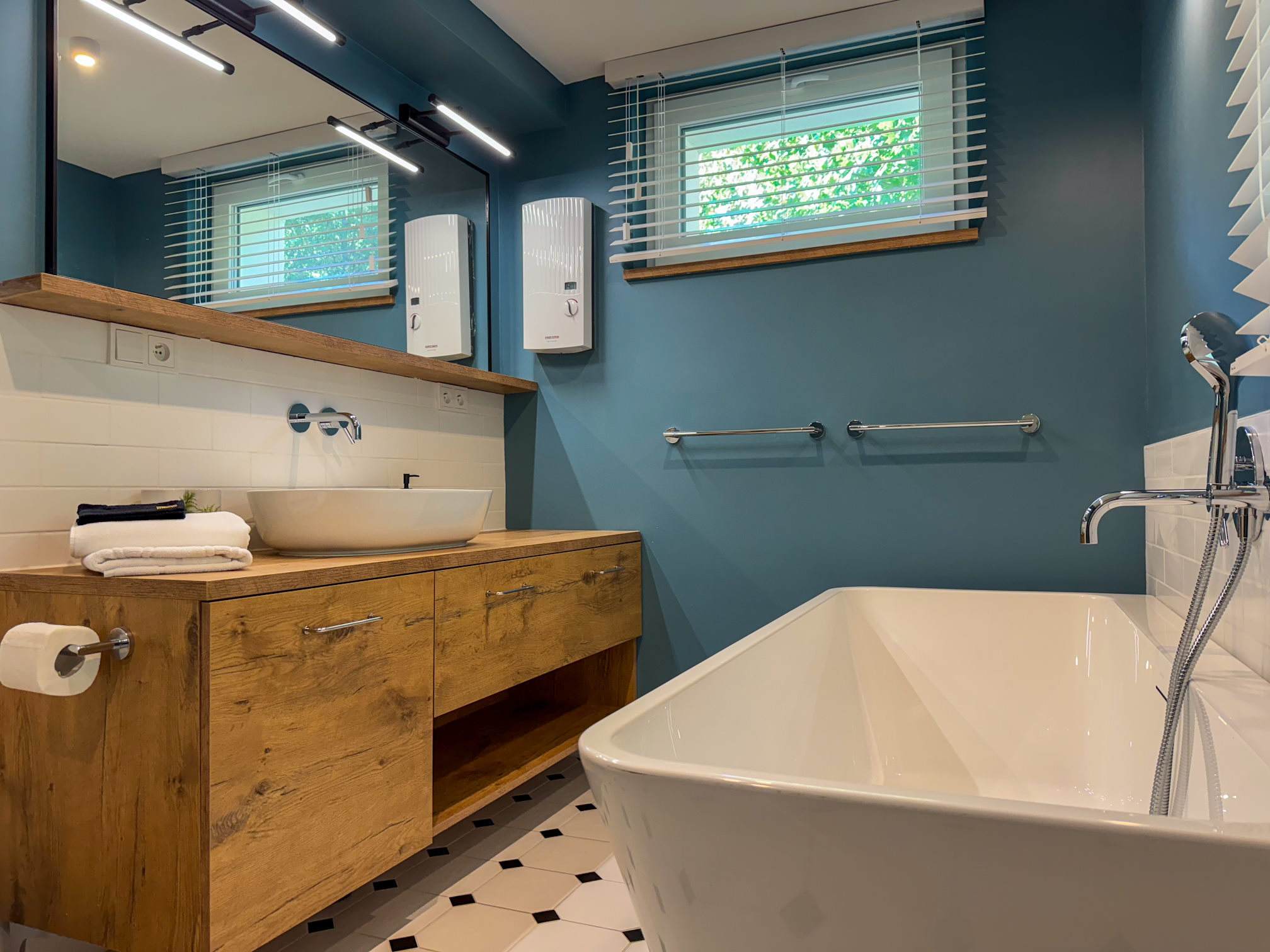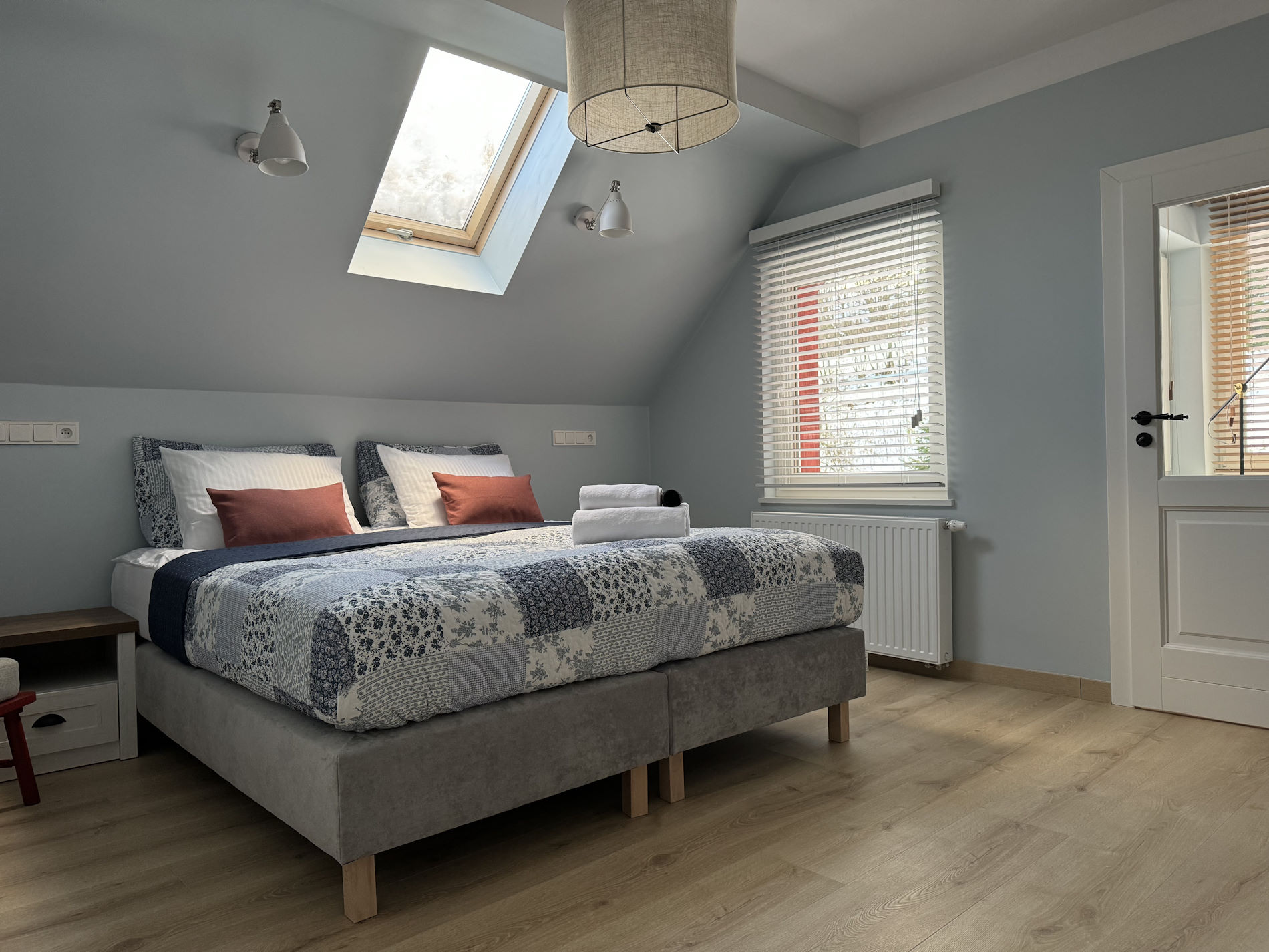 - Apartament niebieski z oddzielną, przylegającą werandą, gdzie jest dodatkowe miejsce do spania dla jednej osoby dorosłej lub dwójki dzieci. Łazienka, oprócz prysznica, ma dodatkowo zainstalowaną wannę.