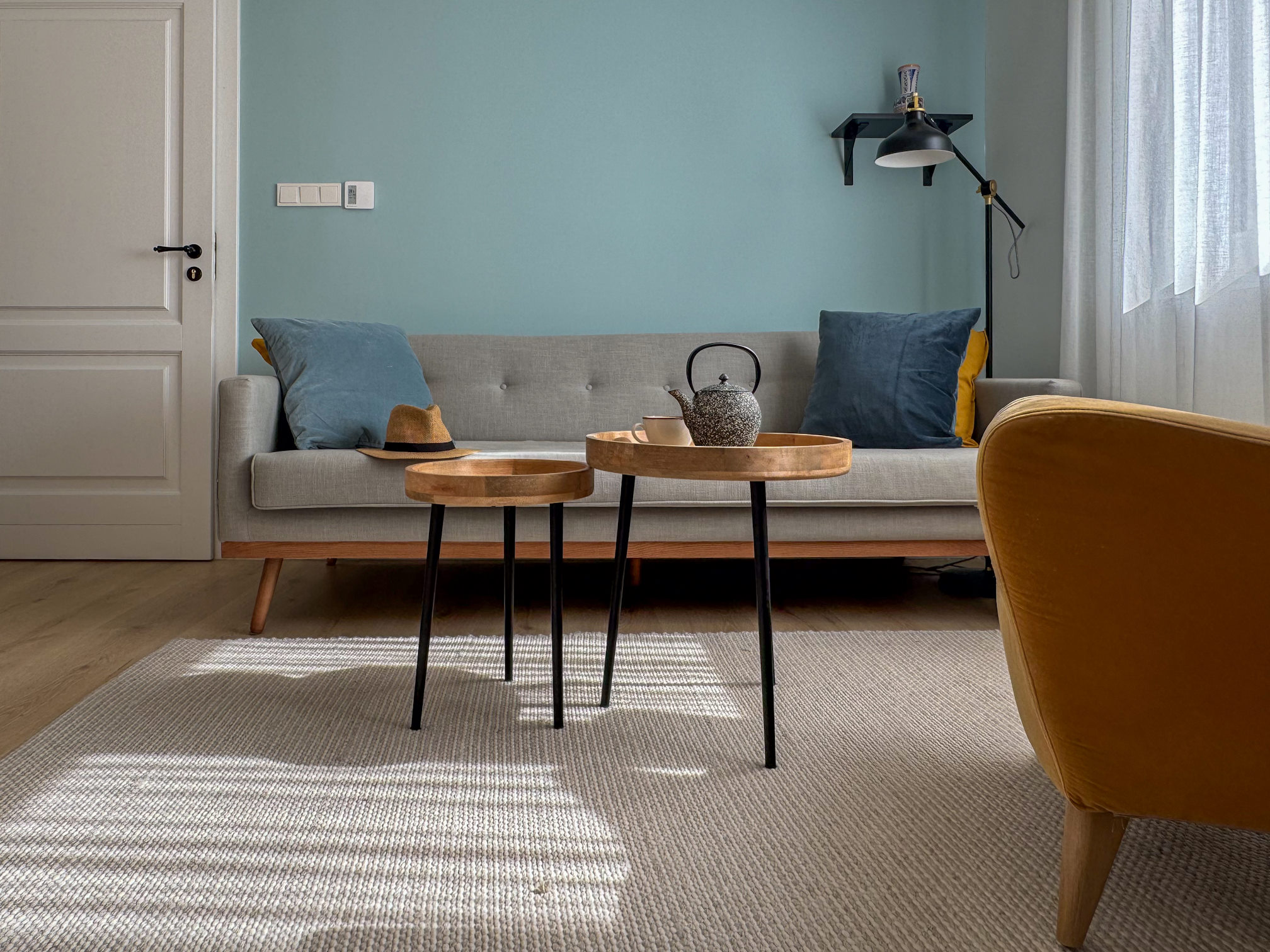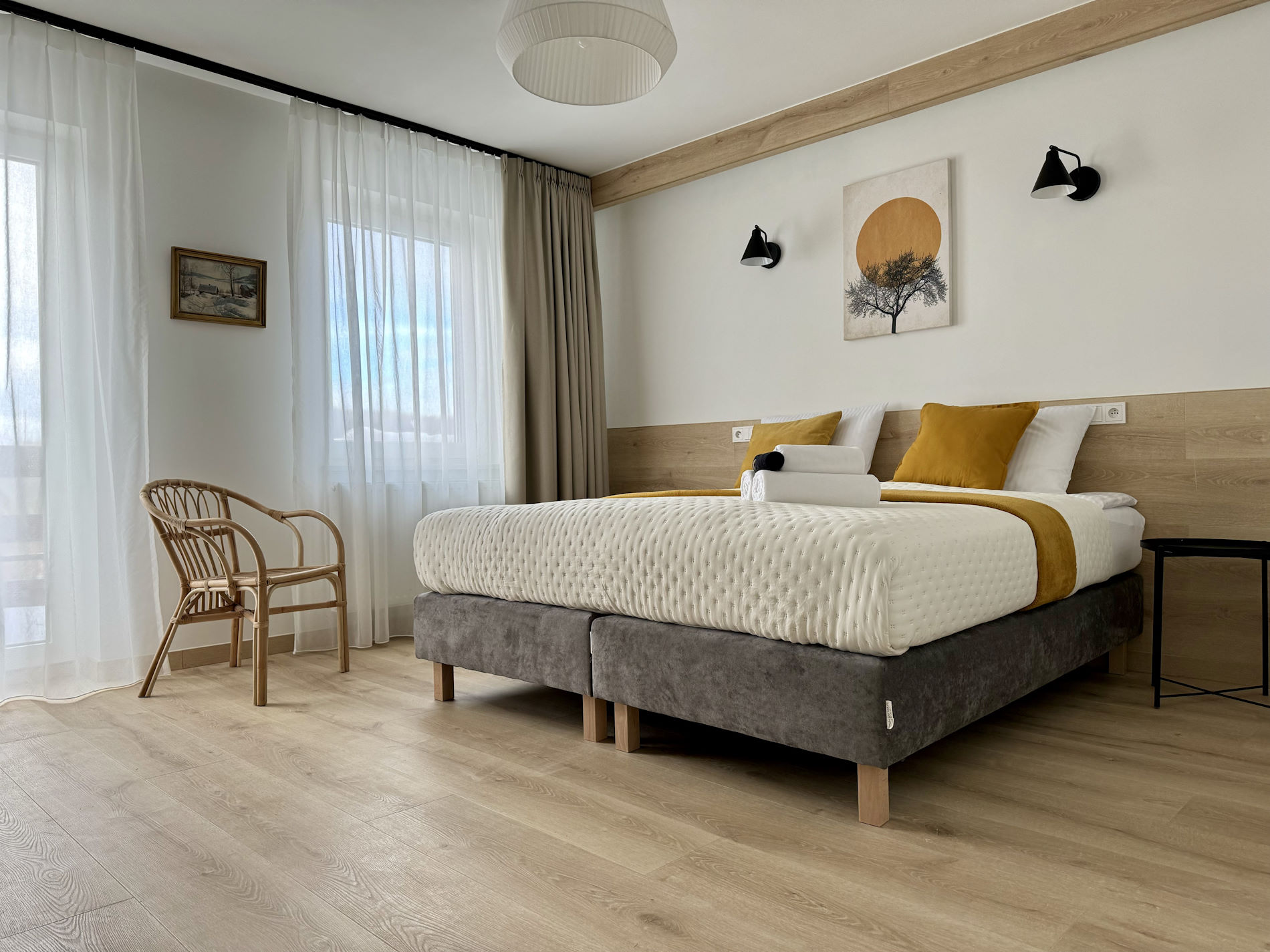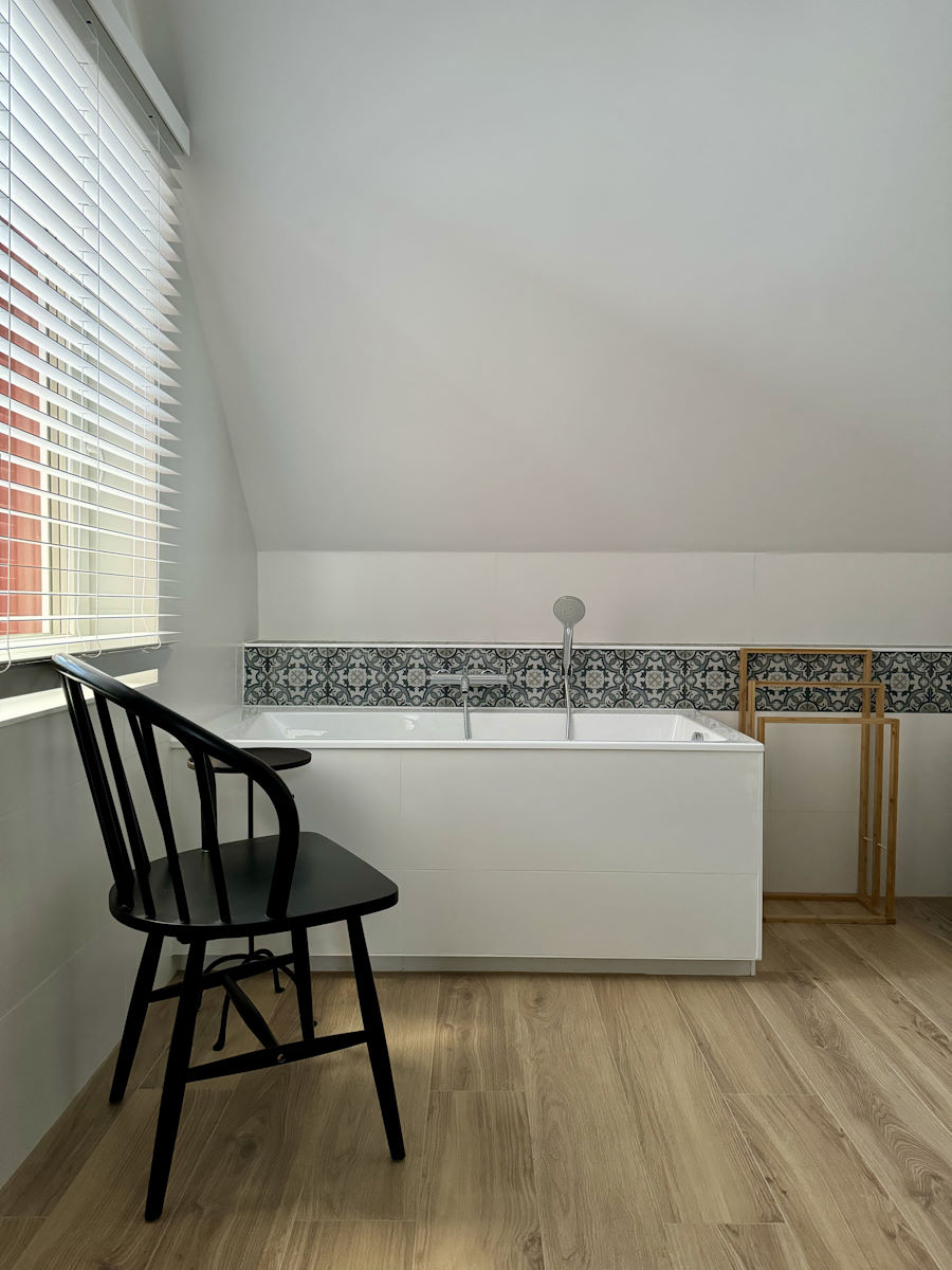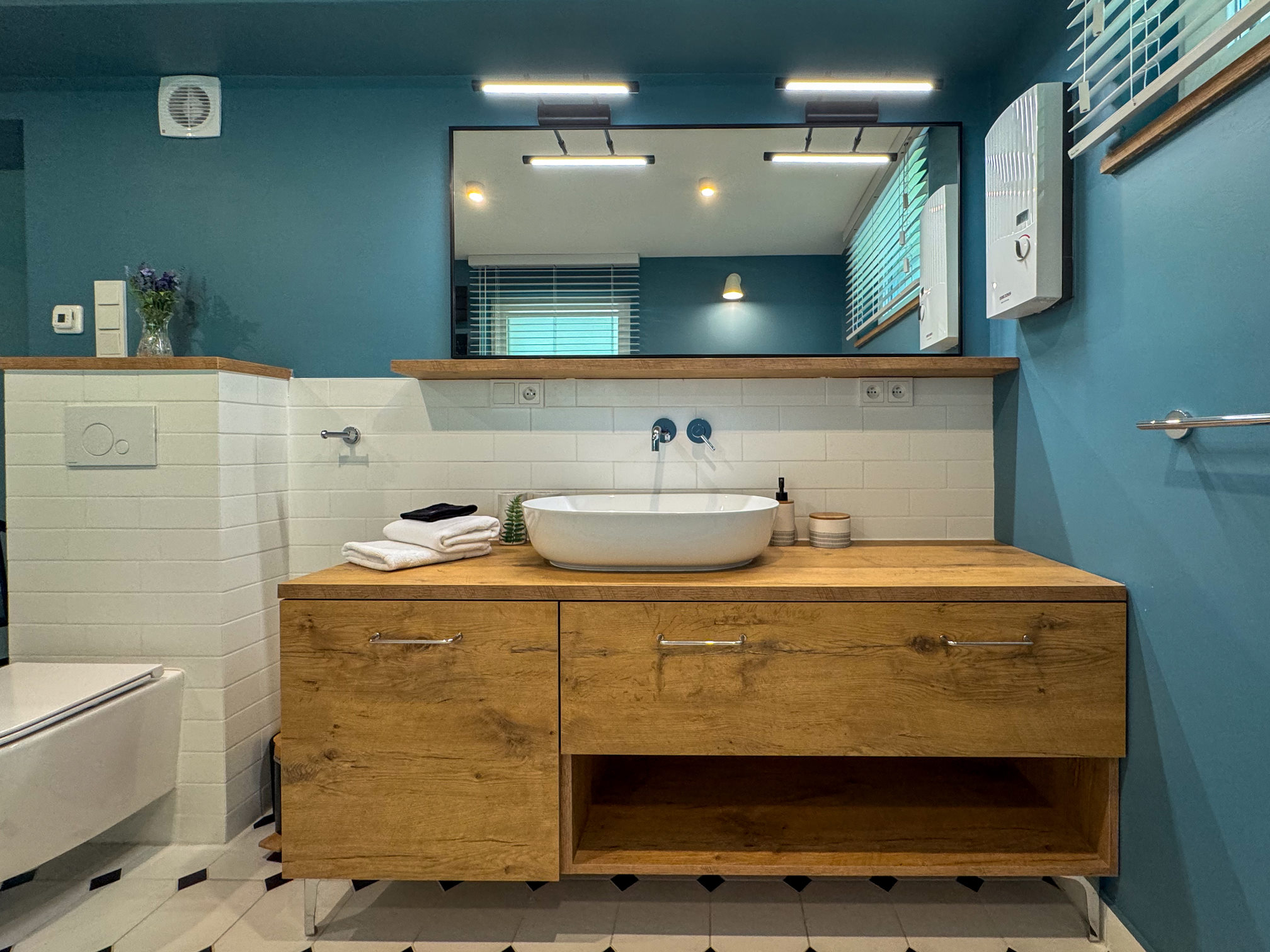 - Apartament niebieski z oddzielną, przylegającą werandą, gdzie jest dodatkowe miejsce do spania dla jednej osoby dorosłej lub dwójki dzieci. Łazienka, oprócz prysznica, ma dodatkowo zainstalowaną wannę.